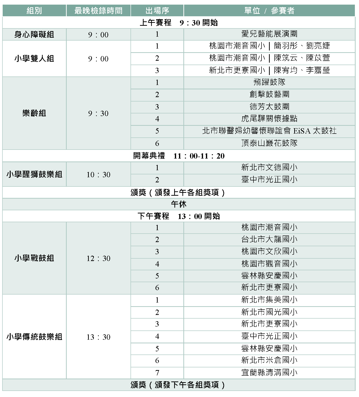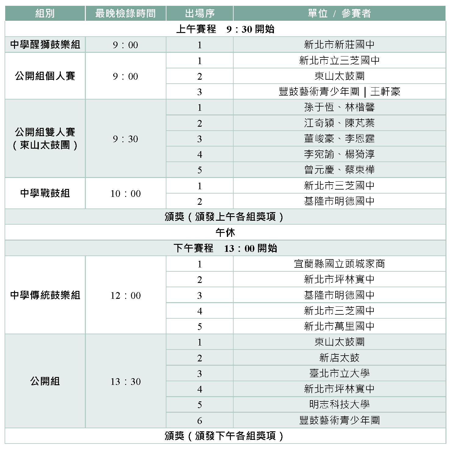 以下為2026泰山鼓藝大賽參賽隊伍名單,請各隊確認是否已完成報名程序,將據此進行後續賽程公告作業。