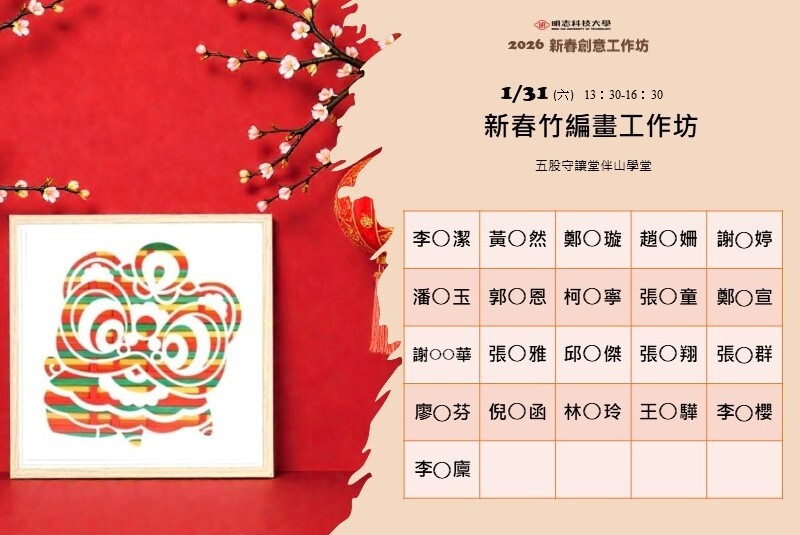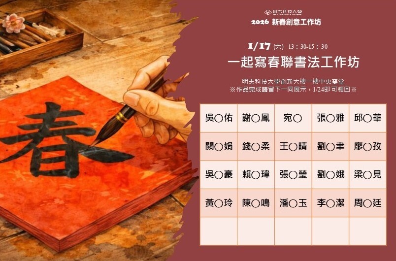 明志科技大學舉辦「2026新春創意工作坊」,以手作迎新年,體驗書法與竹編的節慶魅力!用創意與手作迎接嶄新的一年!